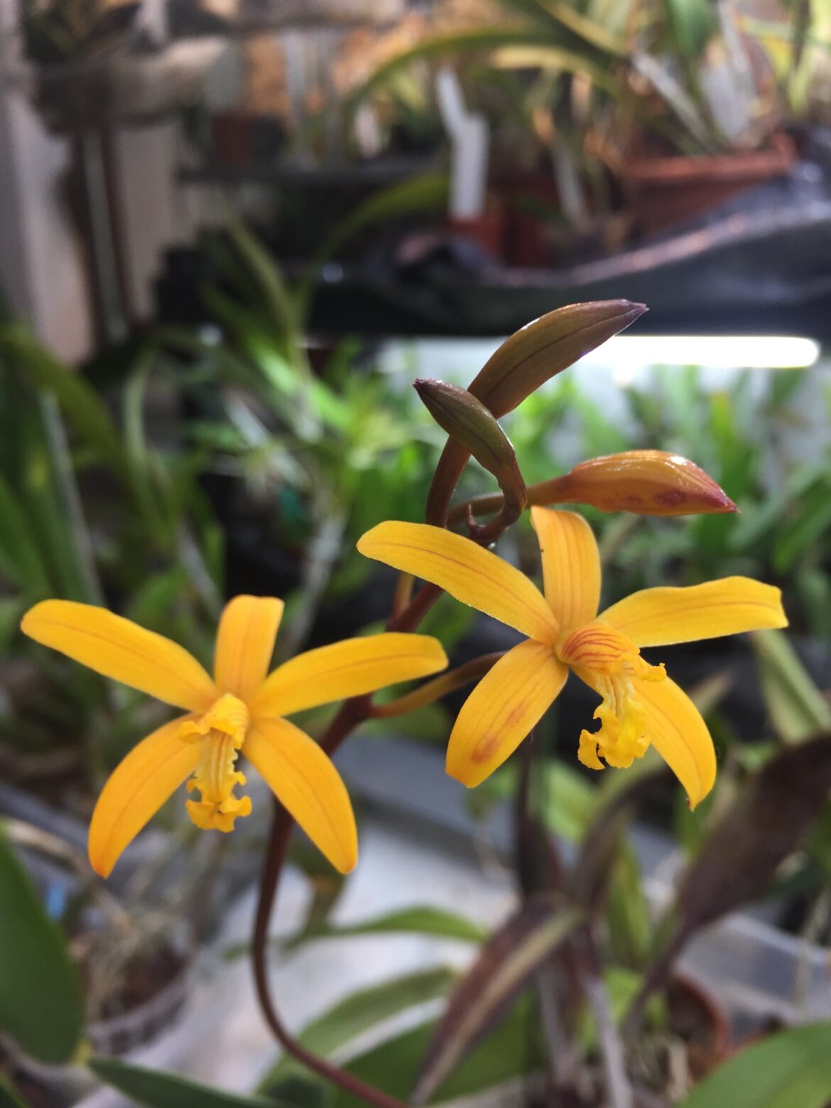 - La Laelia ha passato l’inverno in veranda, con temp. min. sui 10 gradi e buona umidità relativa, purtroppo è da un pò che questa orchidea non rifiorisce, così l’ho spostata sulle mensole esattamente di fronte quelle dove era collocata, vi arriva sole diretto fino alle 10 del mattino ca. qui, infatti, alcune neofinetia si sono bruciacchiate le foglie per la troppa luce, così ho scambiato le postazioni Laelia/Neofinetia sperando di ottenere risultati migliori.