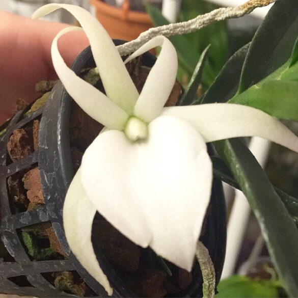 L’ Angraecum Didieri è un’orchidea da serra intermedio calda, fiorisce in tarda primavera, tra aprile e giugno, e viene coltivata bene in cestello o su zattera, perchè ama le radici areate e tende a farle marcire in vaso. Tuttavia avevo difficoltà a mantenerla umida nel vaso a cestello e l’ho trasferita in vaso di terracotta forato, che sembra una soluzione ottimale, grazie proprio alla traspirazione della terracotta.